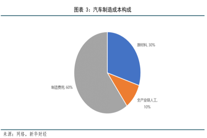 而在汽车的制造成本中,原材料占25%-30%,全产业链人工占比10%,制造费用占比约60%。