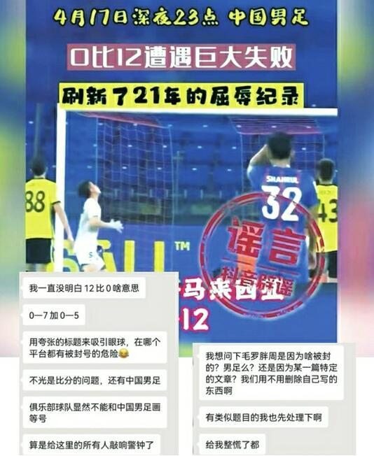 近日在网络上疯传的“国足0:12输给马来西亚”更是将亚冠联赛上广州队和山东泰山两场比赛的比分移花接木。