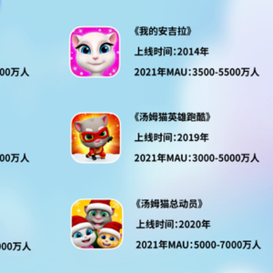 与此同时,汤姆猫在2021年先后研发上线了《弹弹奇兵》《汤姆猫荒野派对》《我的安吉拉2》等多款休闲游戏产品,不断丰富产品类型。其中,公司于暑期档推出了新一代虚拟宠物养成产品《我的安吉拉2》,作为公司经典女性向养成游戏《我的安吉拉》的续作,该产品上线后,获得App Store、Google Play、华为、小米、OPPO、vivo等多个渠道的首页推荐,并迅速跻身100多个国家与地区的App Store、Google Play等应用商店前十下载榜单。新产品的上线及良好的市场表现,为汤姆猫未来的业绩释放打下坚实的基础。