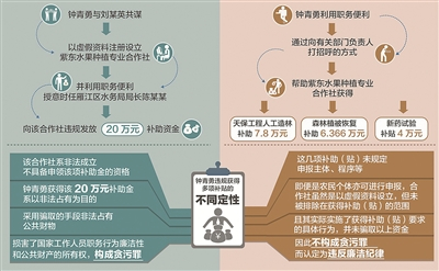 文富军:专案组在审查调查中发现,钟青勇还通过向有关部门负责人打招呼的方式,帮助紫东水果种植专业合作社获得天保工程人工造林补助7.8万元、森林植被恢复补助6.366万元、新药试验补贴4万元。我们查阅了财政部、国家林业局《森林植被恢复费征收使用管理暂行办法》及相关文件,发现天保工程人工造林补助、森林植被恢复补助均未对补助对象作明确要求,新药试验补贴也未明确申报主体条件。实践中,即使是未取得营业资质的农民个体亦可以进行申报。综上,专案组认为,紫东水果种植专业合作社虽是以虚假资料成立,但未被排除在获得补助(贴)的范围,且其实际实施了补助(贴)要求的人工造林、森林植被恢复、新药试验等行为,符合补助(贴)发放条件,并未骗取以上三项补助(贴),不构成贪污罪。而是认定为钟青勇违反廉洁纪律。
