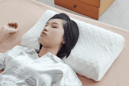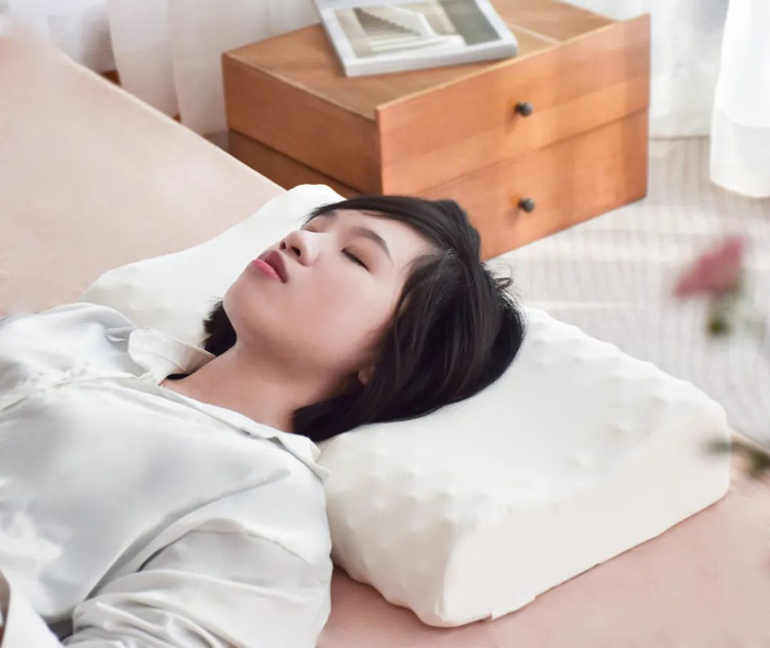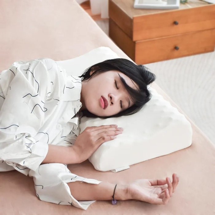 这款枕头采用前高后矮的波浪形设计,睡下去会有种微微陷进枕头里的包裹感,稳稳托住头、颈,人一下子就放松了不少。