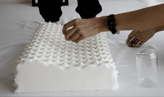 再来看看,把鸡蛋扔到乳胶枕上,不费吹灰之力就弹了起来。