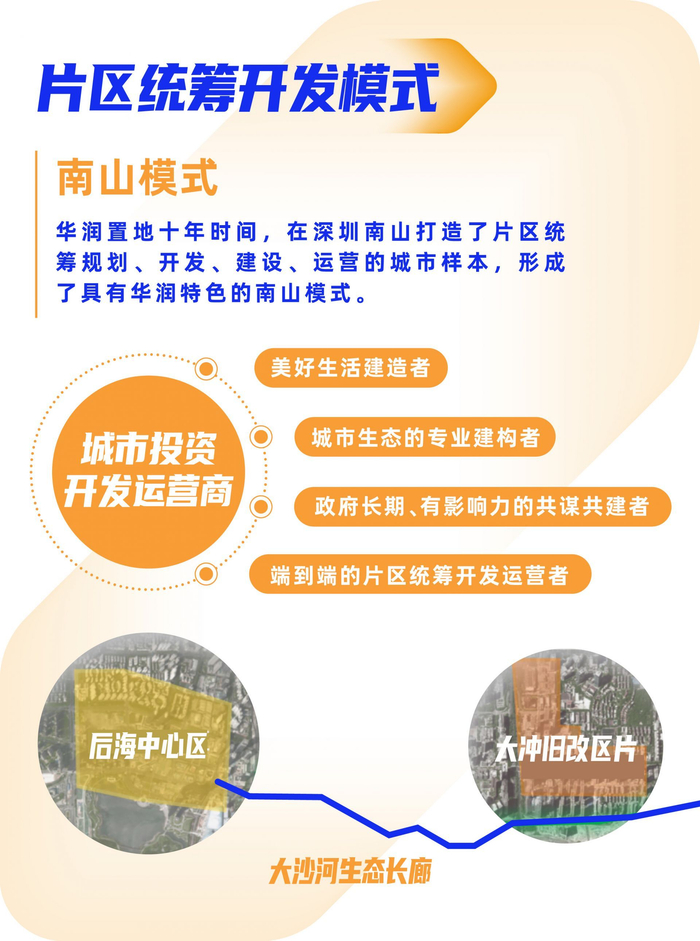 在片区统筹领域,围绕居住社区、商业商务、产业发展、公共服务、基础设施、生态环境、智慧城市、民生保障等城市功能系统,打通 “服务-投资-开发-运营” 全价值链,搭建片区统筹所必备的核心业务能力。其中最具示范效应的“南山模式”,通过“旧城改造+新区建设+生态复兴”联动,成为华润置地城市投资开发运营商的最佳实践和时代样板。