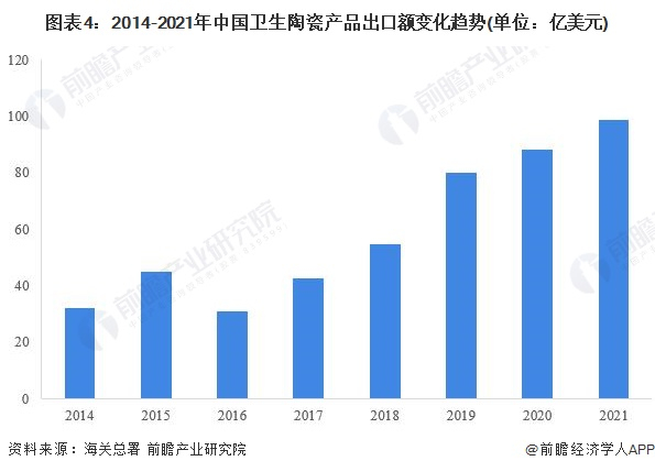 与出口量规模走势类似,我国卫生陶瓷行业主要产品出口呈现震荡上行走势,2021年全年,我国卫生陶瓷产品出口金额98.77亿美元,同比增长12.13%,突破百亿大关指日可待。