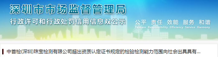 | 处罚名称: | 中首检(深圳)珠宝检测有限公司超出资质认定证书规定的检验检测能力范围向社会出具具有证明作用数据、结果案 |