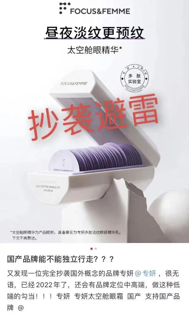 公众号信息显示,创立之初,专姸的产品线以大健康饮品为主,2020年6月开始增加护肤线。目前的品牌定位是“抗衰实验室品牌”,专注“多肽抗衰”,产品采用次抛、可替换芯设计,环保包装。 此次被指包材抄袭的两款精华(专姸太空舱多肽眼部精华、专姸太空舱多肽面部精华)于近半年内相继推出。在小红书上有1000+笔记,“风很大”,且关键词与“新锐国货”、“”国货之光”、“黑马护肤品”、“抗老尖子生”等高度绑定。