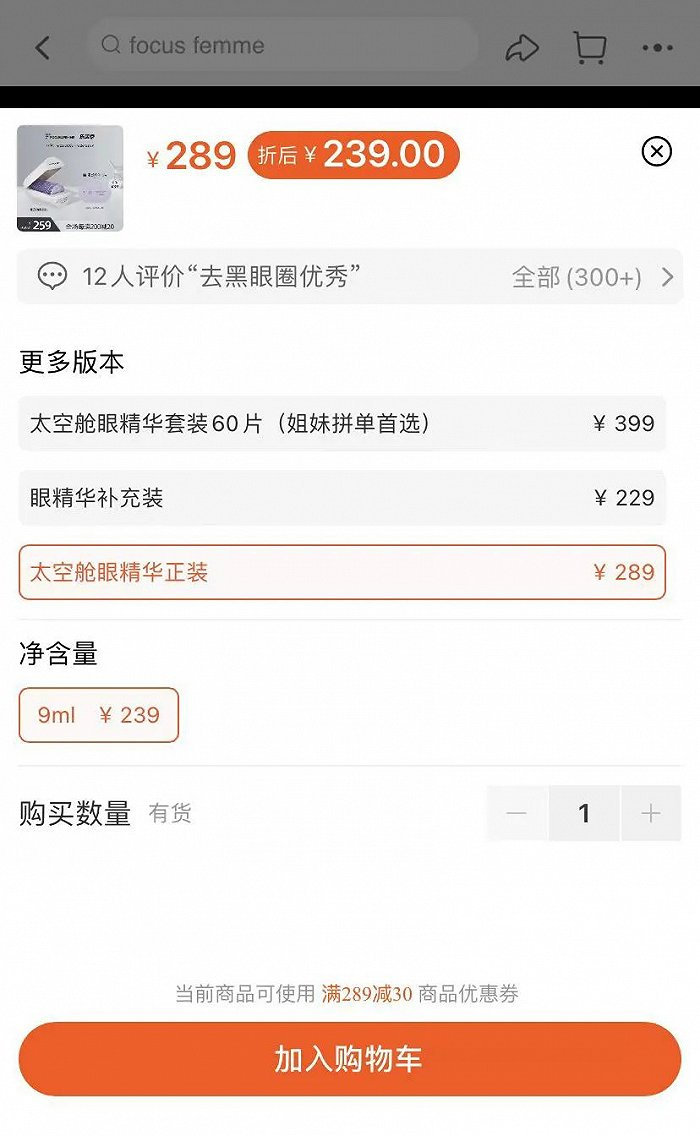 值得注意的是,品牌主打抗老市场,9毫升眼霜售价289元,每毫升售价约32元,堪比雅诗兰黛小棕瓶眼霜。