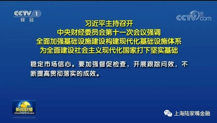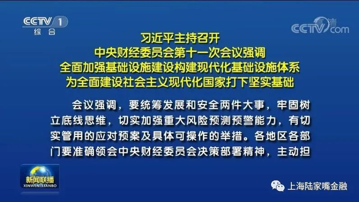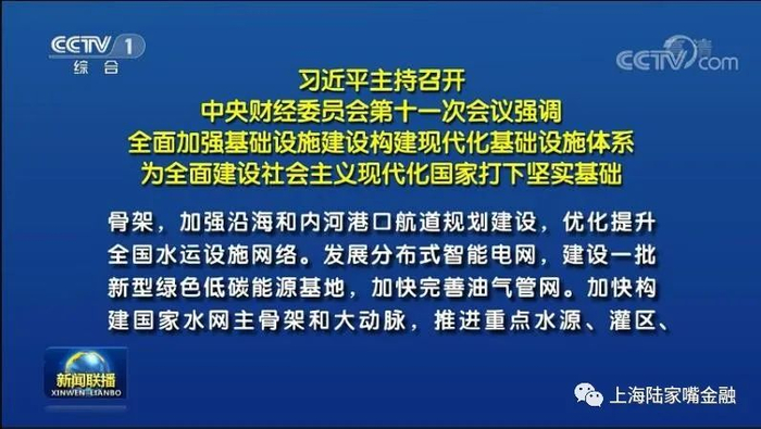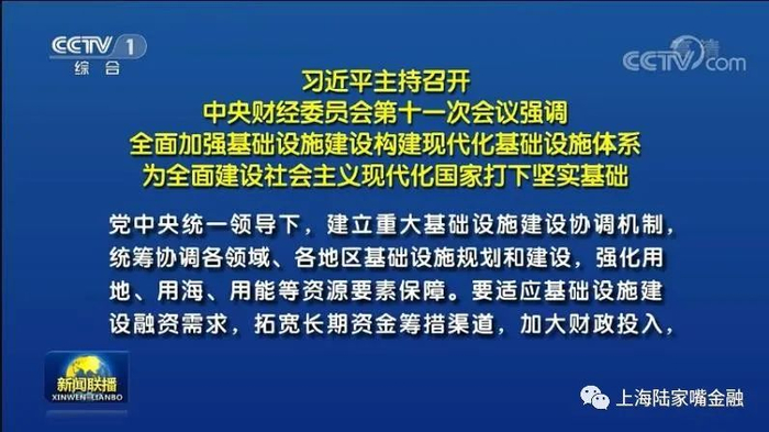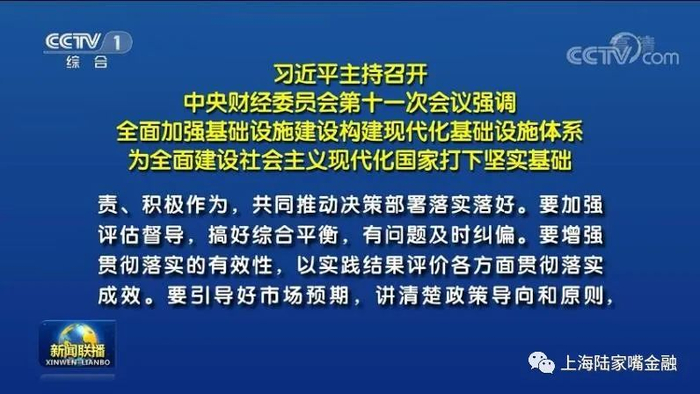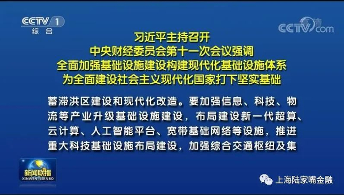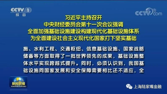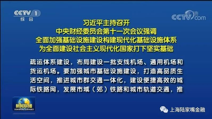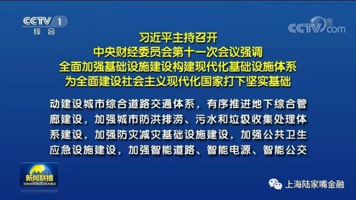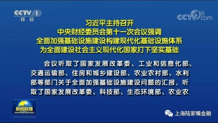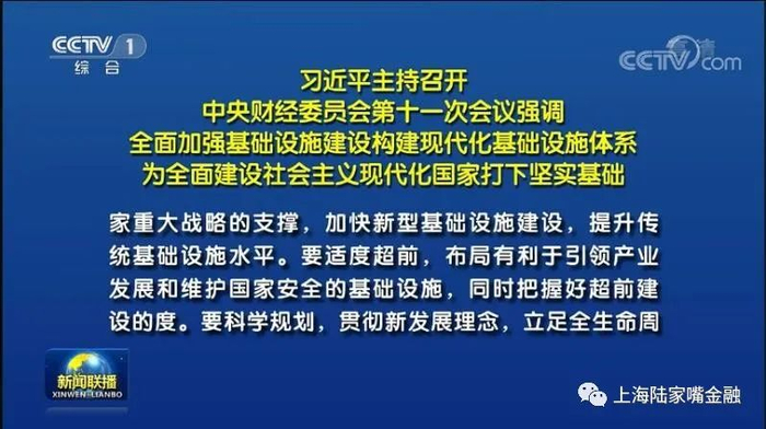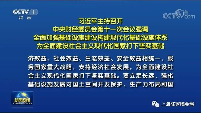 4月26日,中央财经委员会第十一次会议召开,研究全面加强基础设施建设问题。会议指出,要适度超前,布局有利于引领产业发展和维护国家安全的基础设施,同时把握好超前建设的度。会议还指出了五个布局重点,包括交通、能源、水利等网络型基础设施建设;信息、科技、物流等产业升级基础设施建设;城市基础设施建设;农业农村基础设施建设;国家安全基础设施建设。