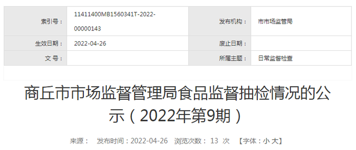 河南省商丘市市场监管局抽检食品37批次 不合格4批次