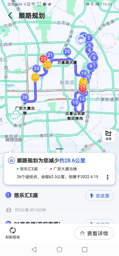 据了解,目前高德工作地图已可支持多达50个途经点的智能顺路规划,帮助外勤工作者有效节省出行成本和时间。