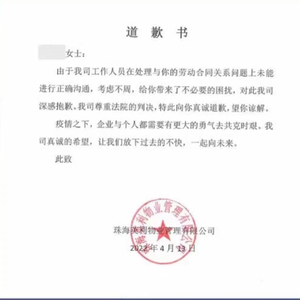 4月11日,因怀孕被辞退而维权三年的樊女士(化名)收到了前雇主珠海英利物业管理有限公司(以下简称“英利物业”)的上述《道歉书》。4月21日,樊女士领到了该公司赔偿的孕期工资损失和精神抚慰金。
