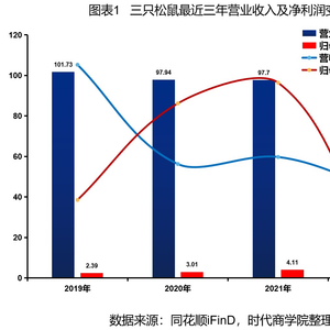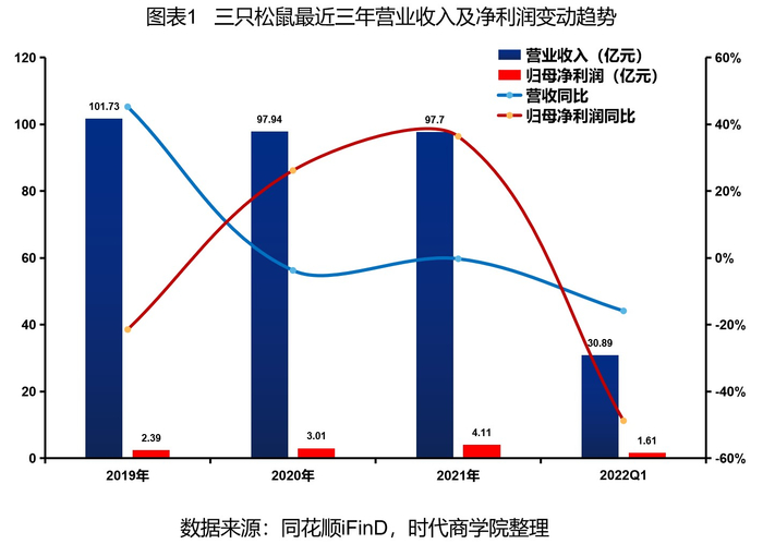 4月22日,三只松鼠同步披露2021年年度报告和2022年一季度报告。其中,年报显示,该公司2021年实现营收97.7亿元,同比下降0.24%。