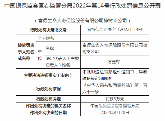 4月27日消息,据中国银保监会宜春监管分局行政处罚信息公开表显示,富德生命人寿保险股份有限公司樟树支公司因未及时送达理赔退件通知书,导致理赔核定超期限被罚款5万元。