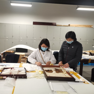 喻燕姣(右)正在指导工作人员对马王堆汉墓出土的文物进行清库建档。图源:湖南省博物馆
