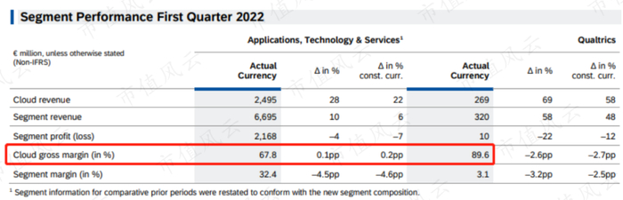 FY22.Q1在IFRS标准下获得毛利50亿欧元,较去年同期上涨12%。其中云服务部分对应的标准毛利19亿欧元,较去年同期上涨33%。
