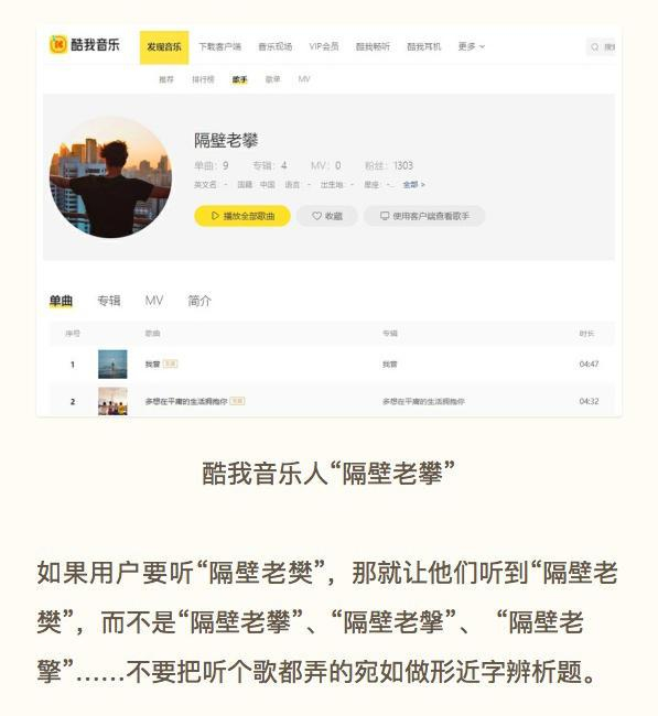 同时,声明中指出,腾讯音乐旗下QQ音乐、酷狗音乐、酷我音乐针对无授权作品制作大量冒名、洗歌作品,误导用户播放。“仅自2020年以来,腾讯音乐针对我方热门歌曲,就先后推出大量假冒同名歌曲,其中近千首歌曲的副歌部分与原歌曲相同或近似。部分冒名歌曲的演唱者姓名都‘高仿’原作歌手。如在腾讯音乐娱乐集团旗下某产品以‘隔壁老攀’冒名音乐人‘隔壁老樊’,并违规上架相关作品。以此误导用户点击收听,蹭热度骗流量。”声明中还指出,腾讯音乐娱乐集团长期对网易云音乐的视觉设计、产品功能、创新机制等进行了抄袭。