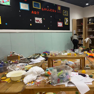 4月18日,记者来到和谐广场店,几十位家长仍然等在店里。一位爸爸四处翻找门店里值钱的东西,希望弥补一些损失,最后拎走了几副乒乓球拍。原本宽敞、有序的教室一片混乱,玩具、颜料、拼图,还有拆封了的意大利面条散落各处。更多的家长坐在一起研究转课单,他们无法和机构达成共识,一直僵持着。