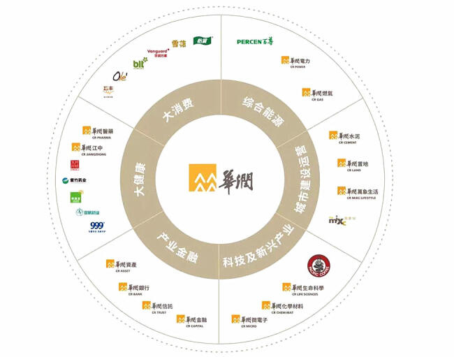 华润的产业已涵盖大消费、综合能源、城市建设与运营、大健康、产业金融、科技及新兴产业六个领域,涉及地产开发、零售、电力、水泥、燃气、医药、银行、半导体等20多个行业。