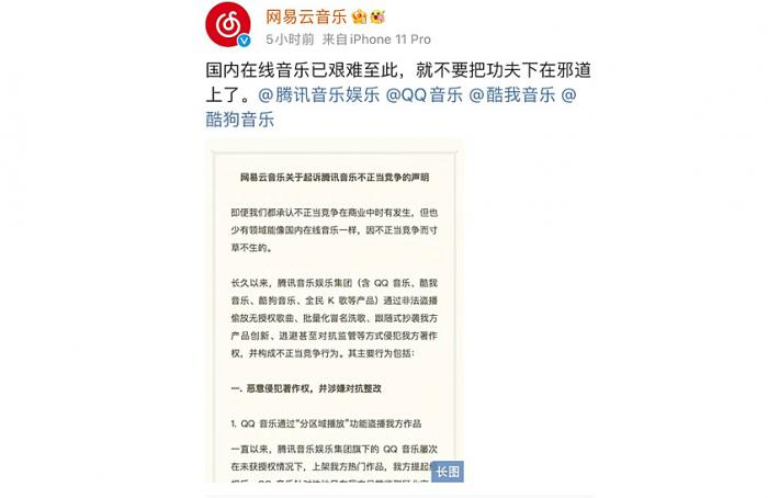 4月27日上午10点,网易云音乐微信公号发布一篇文章,洋洋洒洒近3000字的声明,控诉腾讯音乐在音乐著作权、产品设计等方面,涉嫌侵权。