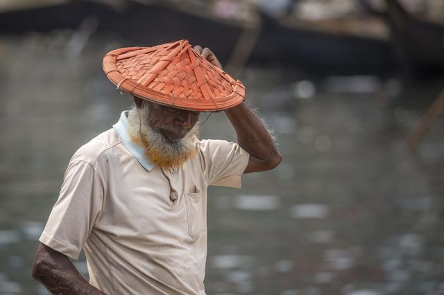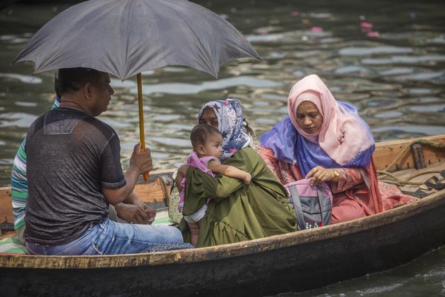 当地时间2022年4月27日,孟加拉国达卡,民众撑着伞过布里甘加河。据孟加拉国气象部门(BMD)预计,孟加拉国部分地区仍将高温。