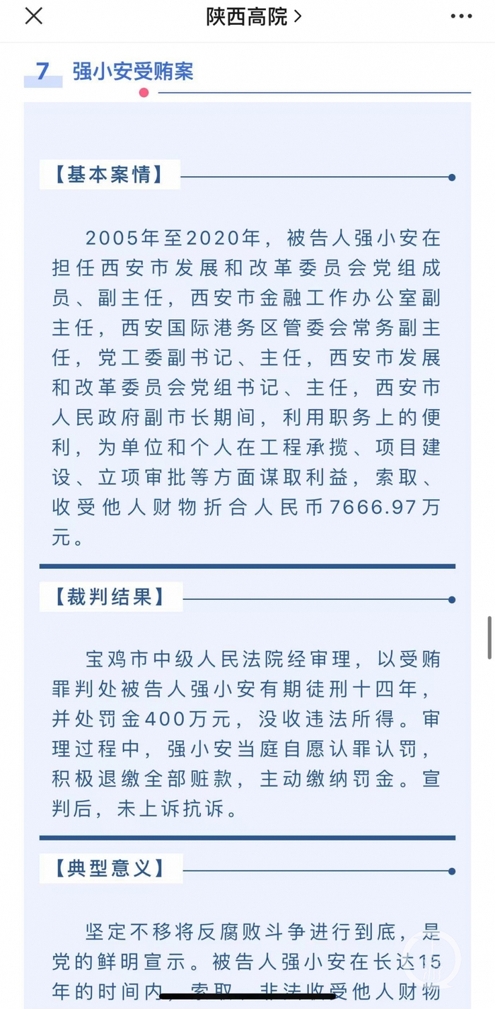 今年4月25日,陕西省高级人民法院发布“2021年度陕西法院十大审判执行案件”,首次披露强小安受贿案的判决。图片来源/网络截图