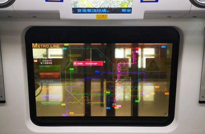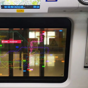 透明OLED显示屏的出现,完美解决了这一问题,抢占智慧交通的发展先机。早在2020年4月,北京地铁6号线就使用了透明OLED显示屏。列车启动后,能够在车窗上显示地铁运行线路图及周边商圈等基本信息,丝毫不影响乘客观赏车外的风景。时隔6个月,深圳于地铁10号线开通时,在地铁车窗上使用了同样的透明OLED显示屏,能够通过3D图层渲染技术向乘客实时展示各类资讯。