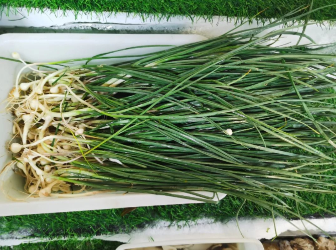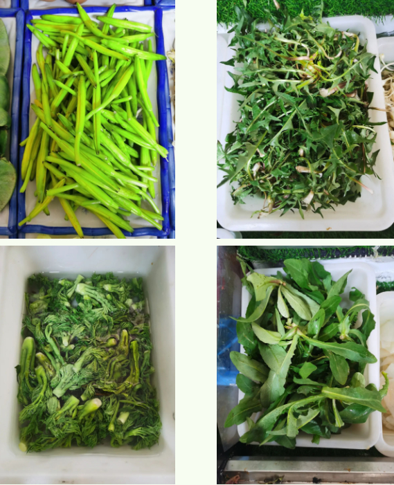 在六大铁锅农家院,处理好的野菜摆放整齐,叶片新鲜干净,有苣荬菜、刺嫩芽、小根蒜、蒲公英、香椿等品种。