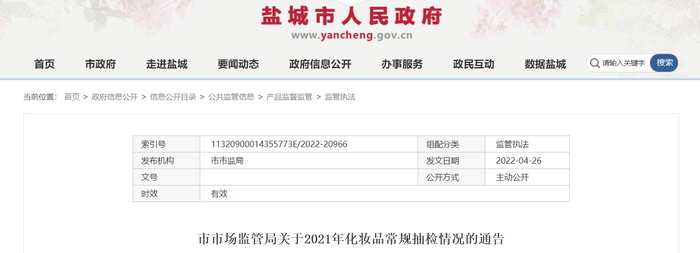 江苏省盐城市市场监督管理局通告2021年化妆品常规抽检情况