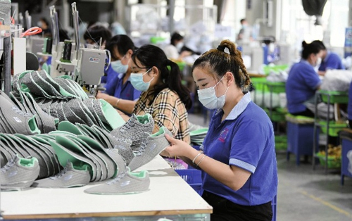 防疫生产两不误 我国各地坚持“动态清零”总方针不动摇,积极出台多项政策举措,稳定市场主体,助力有序生产。图为在福建福州仓山区一家鞋企生产线上,工人在生产运动鞋。新华社