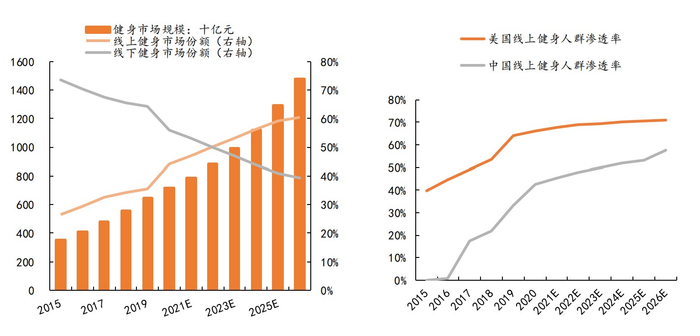 4月27日,中泰证券引用灼识咨询报告称,到2026年,中国健身市场的市场规模有望从2021年的7866亿元增至2026年14793亿元,复合年增长率为13.5%;2021年中国线上健身市场达到3701亿元,预计2026年将增加至8958亿元,复合年增速为19.3%。