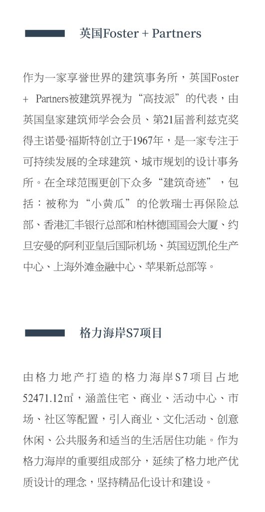 格力地产邀请被建筑界视为“高技派”代表的英国Foster + Partners操刀呈现一处依海而建的“舒适生活目的地”——格力海岸S7项目,将为格力海岸引入全新的商业、文化活动、创意休闲、公共服务和生活居住功能。