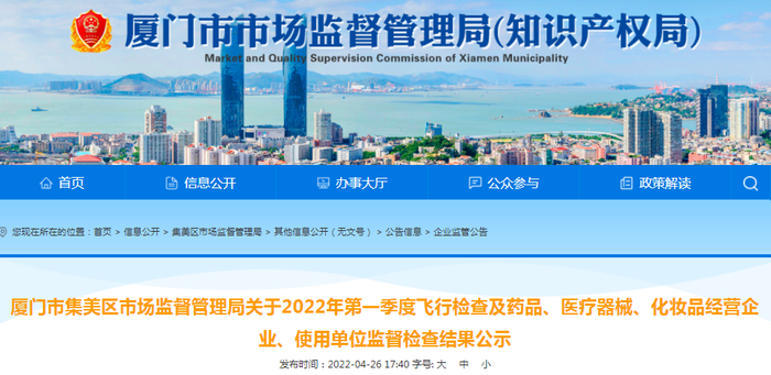 厦门市集美区市场监管局公示2022年第一季度飞行检查及药品、医疗器械、化妆品经营企业、使用单位监督检查结果