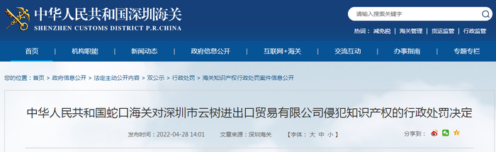 蛇口海关发布对深圳市云树进出口贸易有限公司侵犯知识产权的行政处罚决定