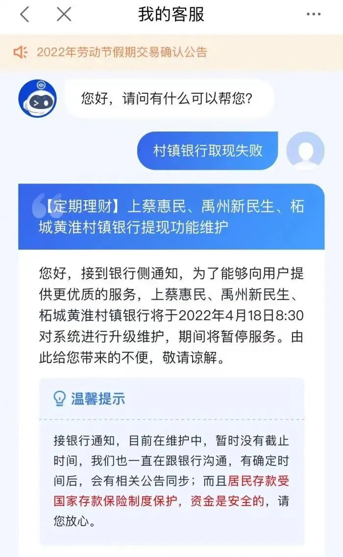 自4月18日至今,3家村镇银行的线上业务一直处于“系统维护”之中,能否取款、何时取款是各位存款人最关心的问题。也有前往当地线下取款的存款人透露,当地也仅仅是排号,拿到一张号单后等到指定时间取款,当时已排到五月中旬。并且,外地人前往,还涉及到防疫问题。