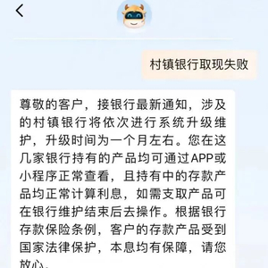 对这些平台咨询后,滨海国金所回复称,“接银行最新通知,涉及的村镇银行将依次进行系统升级维护,升级时间为一个月左右。您在这几家银行持有的产品均可通过APP或小程序正常查看,且持有中的存款产品均正常计算利息,如需支取产品可在银行维护结束后去操作。根据银行存款保险条例,客户的存款产品受到国家法律保护,本息均有保障,请您放心。”