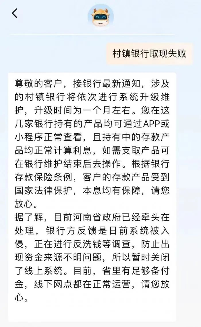 “据了解,目前河南省政府已经牵头在处理,银行方反馈是日前系统被入侵,正在进行反洗钱等调查,防止出现资金来源不明问题,所以暂时关闭了线上系统。目前,省里有足够备付金,线下网点都在正常运营,请您放心。”该回复同时称。