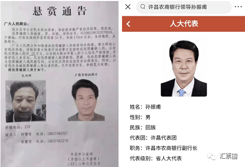 今年3月5日,许昌市公安悬赏10万元通缉许昌农商行副行长孙振甫,通告称其涉嫌严重经济犯罪在逃。