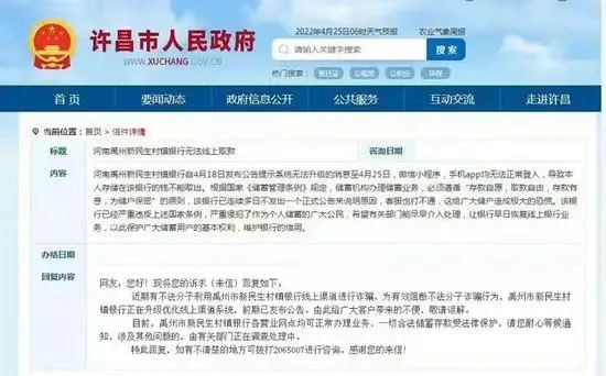 4月25日,许昌市人民政府就“禹州新民生银行线上储户取款难”问题回复相关网友:“近期有不法分子利用禹州市新民生村镇银行线上渠道进行诈骗。为有效阻断不法分子诈骗行为,禹州市新民生村镇银行正在升级优化线上渠道系统,前期已发布公告。目前,禹州市新民生村镇银行各营业网点均可正常办理业务,一切合法储蓄存款受法律保护,请您耐心等候通知,涉及其他问题的,由有关部门正在调查处理中。”