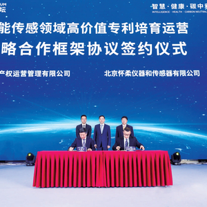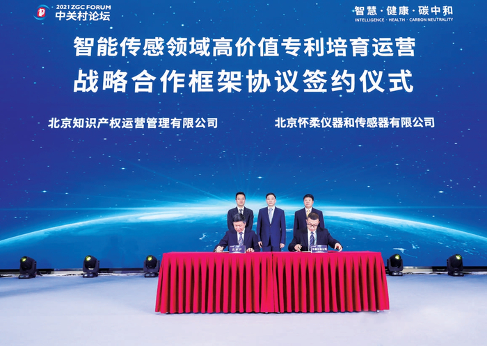 2021年中关村论坛“全球知识产权保护与创新论坛”上,北京IP与北京怀柔仪器和传感器有限公司签订“智能传感领域高价值专利培育运营战略合作框架协议”