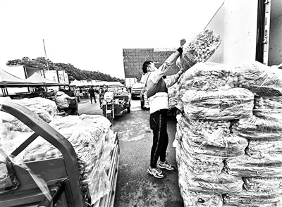 昨日小雨,对交易有些影响。北青报记者在市场蔬菜区看到,商户都备有遮雨棚,各类蔬菜也都提前进行打包,采购的人来了直接问价、称重、装车,整个流程十分顺畅。