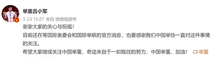 吕小军在社交媒体上的回应相对简短:“谢谢大家的关心与祝福!目前还在等国际奥委会和国际举联的官方消息,也要感谢我们中国举协一直对这件事情的关注。希望大家继续关注中国举重,奇迹来自于一如既往的努力,中国举重,加油!”
