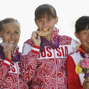 只不过那张照片定格的瞬间,切阳什姐手里拿着的还是铜牌。居中的是俄罗斯选手拉什马诺娃,获得银牌的是另一名俄罗斯选手卡尼斯金娜。
