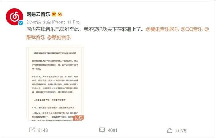 4月27日上午,网易云音乐在其官方微博和微信公众号发布《关于起诉腾讯音乐不正当竞争的声明》。声明指出,网易云音乐已就腾讯音乐娱乐集团(含QQ音乐、酷我音乐、酷狗音乐等产品)的部分不正当竞争行为正式提起诉讼。