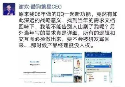 随后,酷狗音乐副总裁谢欢发朋友圈疑似回应,“原来我2006年做的QQ一起听功能,竟然有如此深远的战略意义。找到当年的需求文档回味下,我能不能告别人山寨我了呢?另外当年写的需求真是详细,所有的逻辑和交互图必须做出来,要不会被研发骂回来……那时候产品经理挺没人权。”文中,谢欢还贴出了2006年至2007年间写的产品需求文档截图。