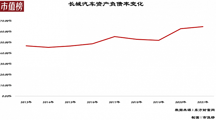 长城汽车的资产负债率在逐渐攀升,从2019年的51.9%到2021年的64.58%。