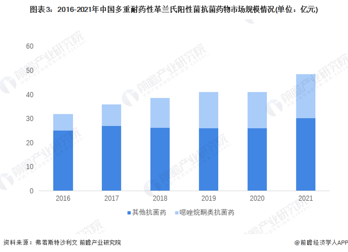 2016-2021年,中国多重耐药性革兰氏阳性菌抗菌药物市场规模整体呈增长趋势,且噁唑烷酮类抗菌药的市场规模和其占比均呈现增长趋势。根据沙利文的研究显示,2020年,中国噁唑烷酮类抗菌药的市场规模达到15亿元。