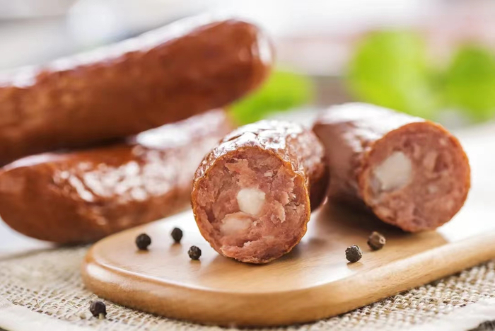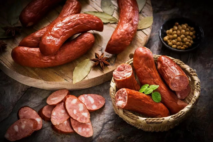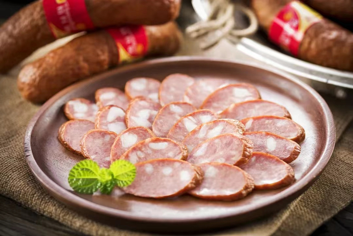 古法腌制低温冷藏,手工将原料分类盛装,准确记录时间、温度、重量、用途,0-4摄氏度低温环境下腌制24-72小时,搭配四川地区上等花椒+云南原产桂皮+天然猪肠衣,香气扑鼻,再采用先进的恒温技术进行烤制,受热均匀使肠体密实又富有弹性。