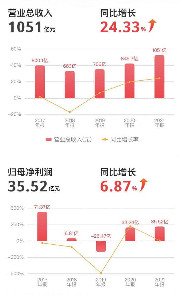4月27日晚间,重庆长安汽车股份有限公司(000625.SZ,下称“长安汽车”)披露2021年年度报告。报告期内,长安汽车营业总收入1051.41亿元,同比增长24.33%,创近五年新高;净利润35.52亿元,同比增长6.87%;扣非净利润由亏转盈,达16.53亿元,同比增长150.85%;经营现金净流量229.72亿元,较去年同期增幅115.17%,现金净流入同比大幅提升。