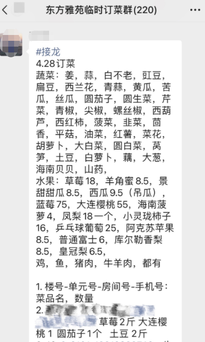 记者在买菜群看到,群成员已经有220余名,工作人员一大早就发布了当天可供选择的蔬菜、水果、肉类品种和价目表,居民以“接龙”的形式在群内留言,写明自己的个人信息和采购需求,采购商会在中午12点后集中采购,当日傍晚蔬菜食品便会供应到小区门口的货架上,由“大白”们统一接收。