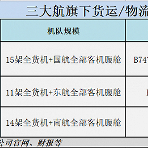 三大航均有相对独立的航空货运或者物流公司,国航旗下国货航前身为国航货运分公司,成立于2003年;东航物流成立于2004年,包括中货航、东航快递、东航供应链等子公司;唯有南航货运业务,多年来以下属货运部的形式存在于上市公司体系内,直到2018年才剥离出去,成立“南航物流”,作为南航全资货运子公司。